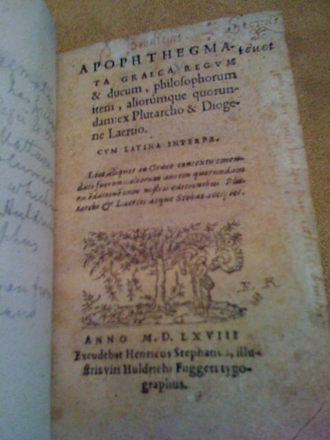 Greek Sayings of the Kings, Generals, Philosophers and Certain Others from Plutarch and Diogenes Laertius, with Latin Translation. Published by Henry Stephanus in 1568. I love all the Latin marginalia in this book,and have been known to fantasize that the initials E. R. next to the printer’s device belong to Elizabeth Regina!