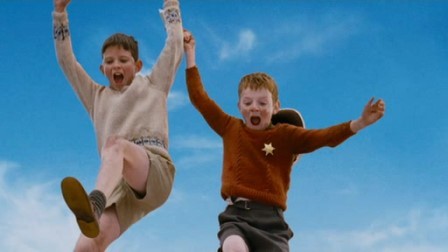 There are a couple of sweet scenes between Jonjo and his Da. The ice cream shop where they share an illicit treat (anything illicit seems to be a specialty of Jonjo’s Da) is memorable, as is a scene where Da instructs Jonjo that you can always judge a man’s worth by the polish of his shoes. This happens as Da preens before the mirror, spreading his legs and leaning back to get a good view of himself, as tall men do… Another priceless scene happens when Mickybo, living out his Butch and Sundance fantasy, tries to rob a bank. The adults in the bank are so smitten with the fierce wee lad that they give him money, reminiscing all the while about old Westerns… not quite the effect Mickybo had intended, but he runs with it and squeezes out an extra offering for his partner, nervously waiting on the “getaway bicycle.”