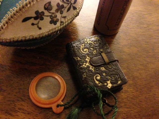 Miniature Korans were also very popular and remain so to this day (as do miniature Bibles). Korans tend to be beautifully ornamented. This one has an attached magnifying glass and is stored in an embroidered, football-shaped container.