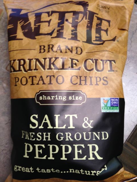 My diastolic blood pressure is a little high, and it’s probably from the extra jolt of salt I’m getting on a daily basis. Yes, dear reader, I go about the workday with a smile on my face, because Ultimate Satisfaction is waiting for me at home. Typically I pour myself a glass of wine (not whine) and measure out a helping of Kettle brand Krinkle Cut Potato Chips for two. No, I don’t eat both servings. I merely lead the Long-Suffering Husband into temptation.