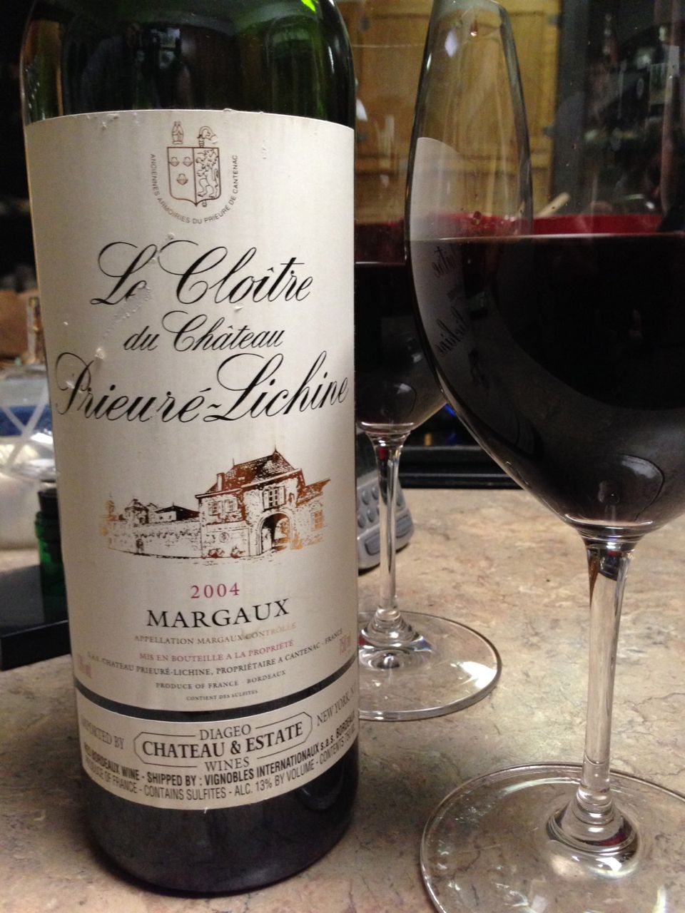 According to Cellartrackers, 2004 Le Cloître du Chateau Prieuré Lichine is over the hill, waning, past its prime. This wine is the second wine of the Chateau. I’m not sure what we paid for it several years ago, but it goes now for the “bargain price” of about $15. We found a neglected bottle sitting in our cellar and decided to give it a whirl with some spaghetti.