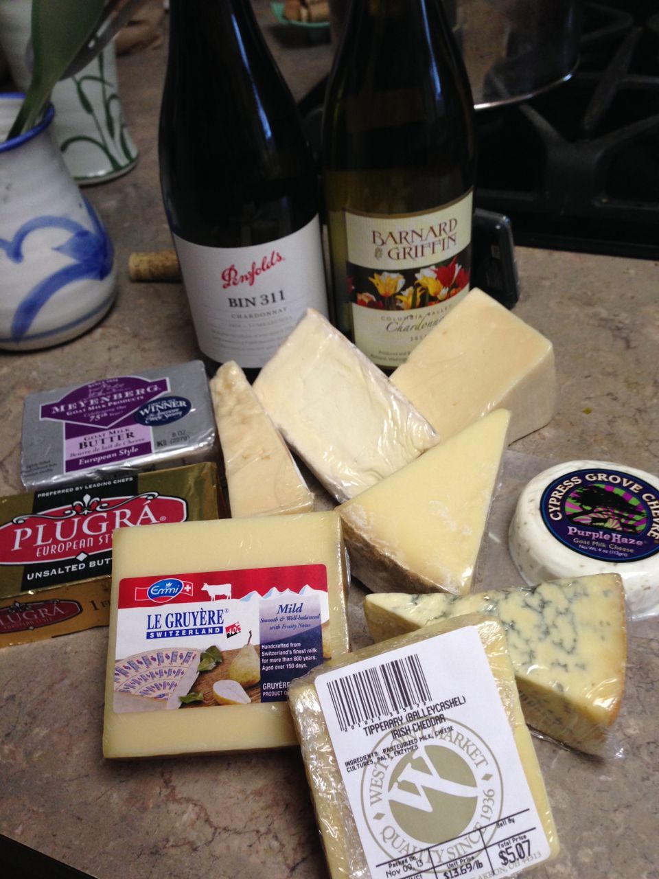 Of course, I have nothing to do with the last-named, but all the others are of exceeding interest to me. (The only department missing is Liquor, but given the generous wine selection, I can’t complain.) Feeling virtuous and in need of restorative substances after accompanying the Long-Suffering Husband to donate platelets (the LSH is a fervent blood donor and has earned his ten-barrel pin, which is equivalent to 4200 gallons or 66.6 hogsheads), I decided to load up with loot, focusing on the kinds that are aged in caves.