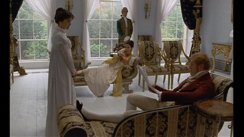 Sir Walter’s idea of economical digs includes liveried footmen and gilt Directoire furnishings. Corin Redgrave plays Sir Walter.