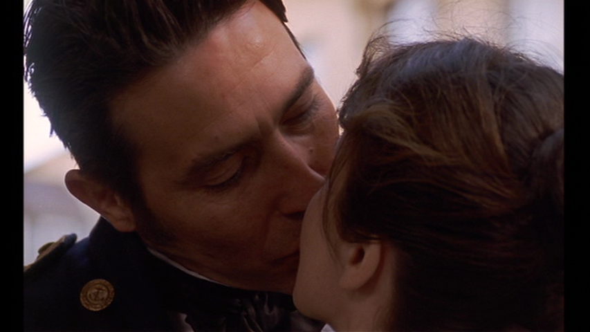Once an understanding is achieved between them, Captain Wentworth kisses Anne. This is one of the film’s anachronisms (there is no kiss in the original, and a public kiss would have violated accepted standards of decorum). It’s a bow to modern taste, after the enforced emotional and verbal restraint that impedes the lovers in most of the film. At the end of both Pride and Prejudice and Persuasion, Austen’s happy couples conduct long conversations about their feelings, once their betrothal makes it safe to declare themselves. This is a substitute for physical affection. Cinematically, however, one image must stand in for the detailed post-game analysis of the books. The kiss in the film is chaste, brief– and extremely satisfying.