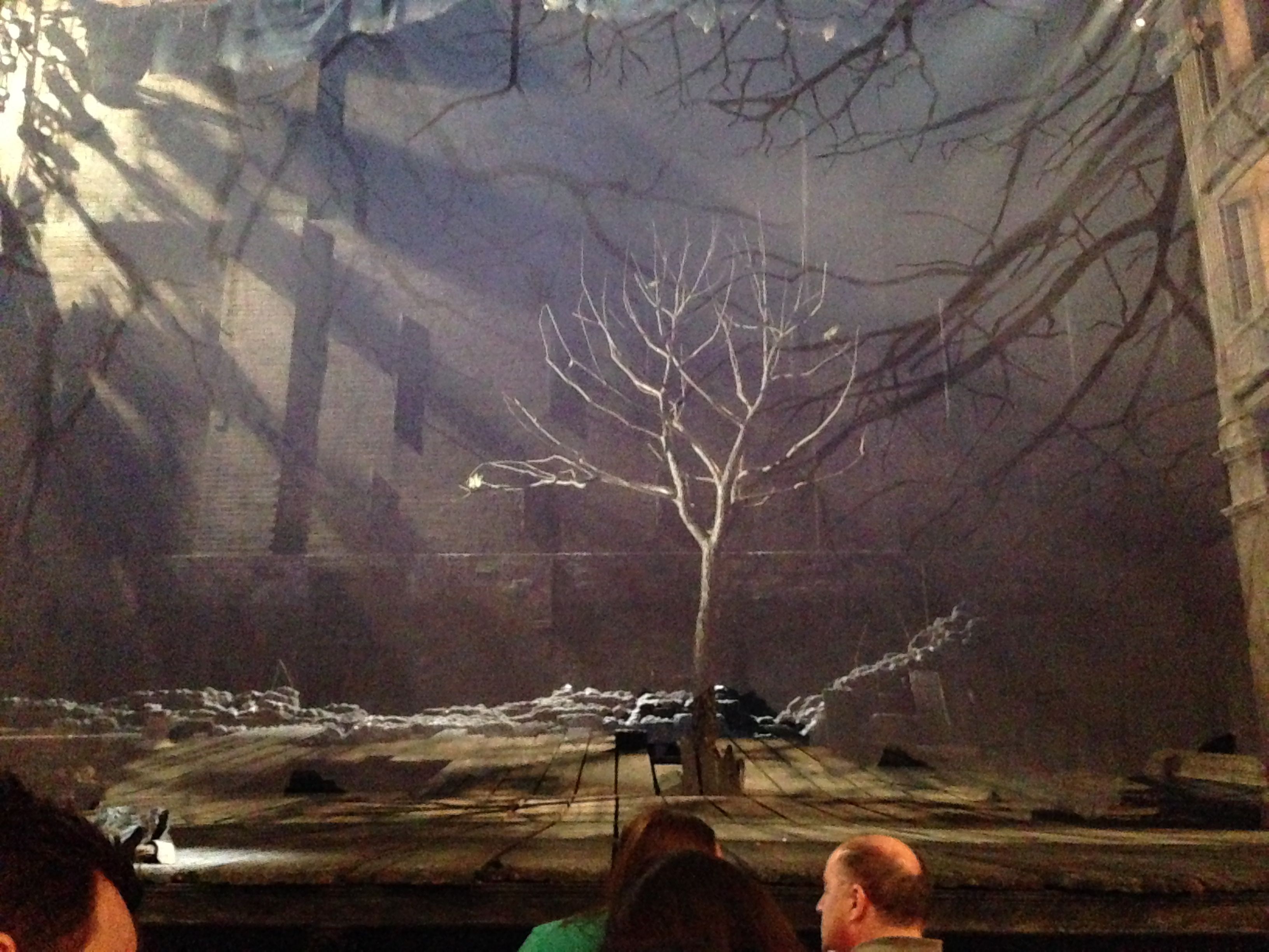 Instead, I found myself laughing and grinning at the comic byplay between childlike Gogo and serious Didi, filled with sadness for the cringing Lucky, and marveling at the bombastic Pozzo’s reversal of fortune. The language echoes Beckett’s master, James Joyce, but is more accessible. My favorite bit happens after Vladimir asks sadly, “What do we do now?” The two men look about them. There is nothing to be seen but a desolate, bare-branched tree.