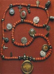 Example of a long coral strand with medals and relicarios (coral is itself a substance often used for amulets, but sadly endangered today). Such strands were handed down as heirlooms. This one, in the Museo Nacional de Historia in Mexico City, belongs to the 18th-19th century. Source: Egan 1993.35.