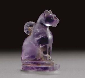 Late Egyptian (probably Ptolemaic) amulet made of amethyst, in the form of a cat, symbol of the goddess Bastet. Click for source.
