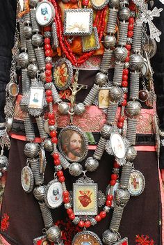Detail of a woman in Salamanca wearing traditional costume, including multiple strands of silver and coral with relicario pendants. In the old days, this jewelry would have made up an important part of a woman’s dowry.
