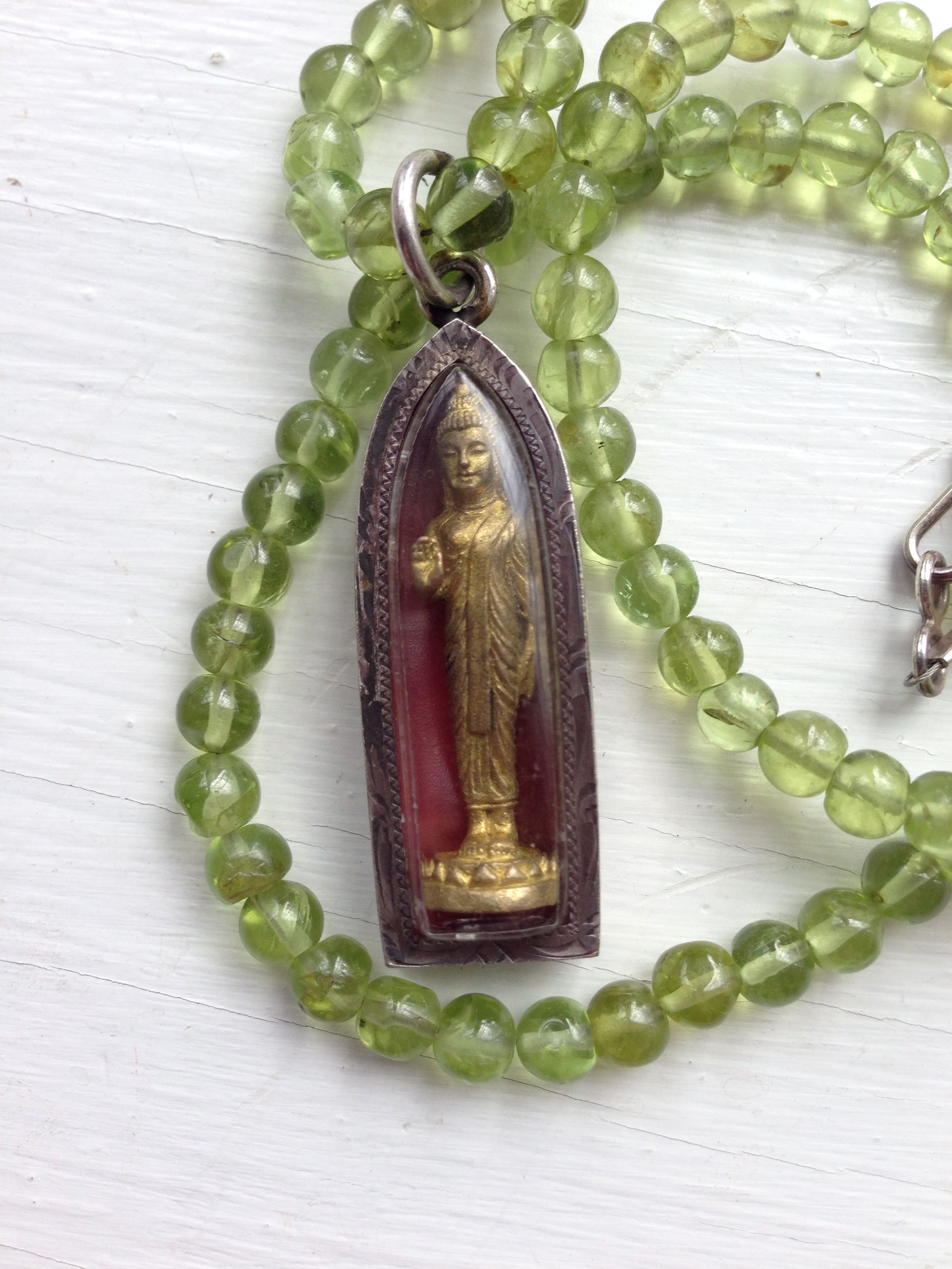 Talismanic and devotional jewelry is found in every tradition. Here are three modern pieces from my collection: (1) Locket of low-grade silver with the face of Christ (Russian Orthodox). This represents a famous icon known as the Mandylia, a piece of cloth on which the face of Jesus was miraculously imprinted. (2) Hand-painted watercolor Buddha in a silver frame from Keliki-Kawan, a noted artists’ village in Bali that is famed for its miniatures. Signed by I Wayan Sugita. (3) Thai Buddha amulet in a silver case on a string of peridot beads.