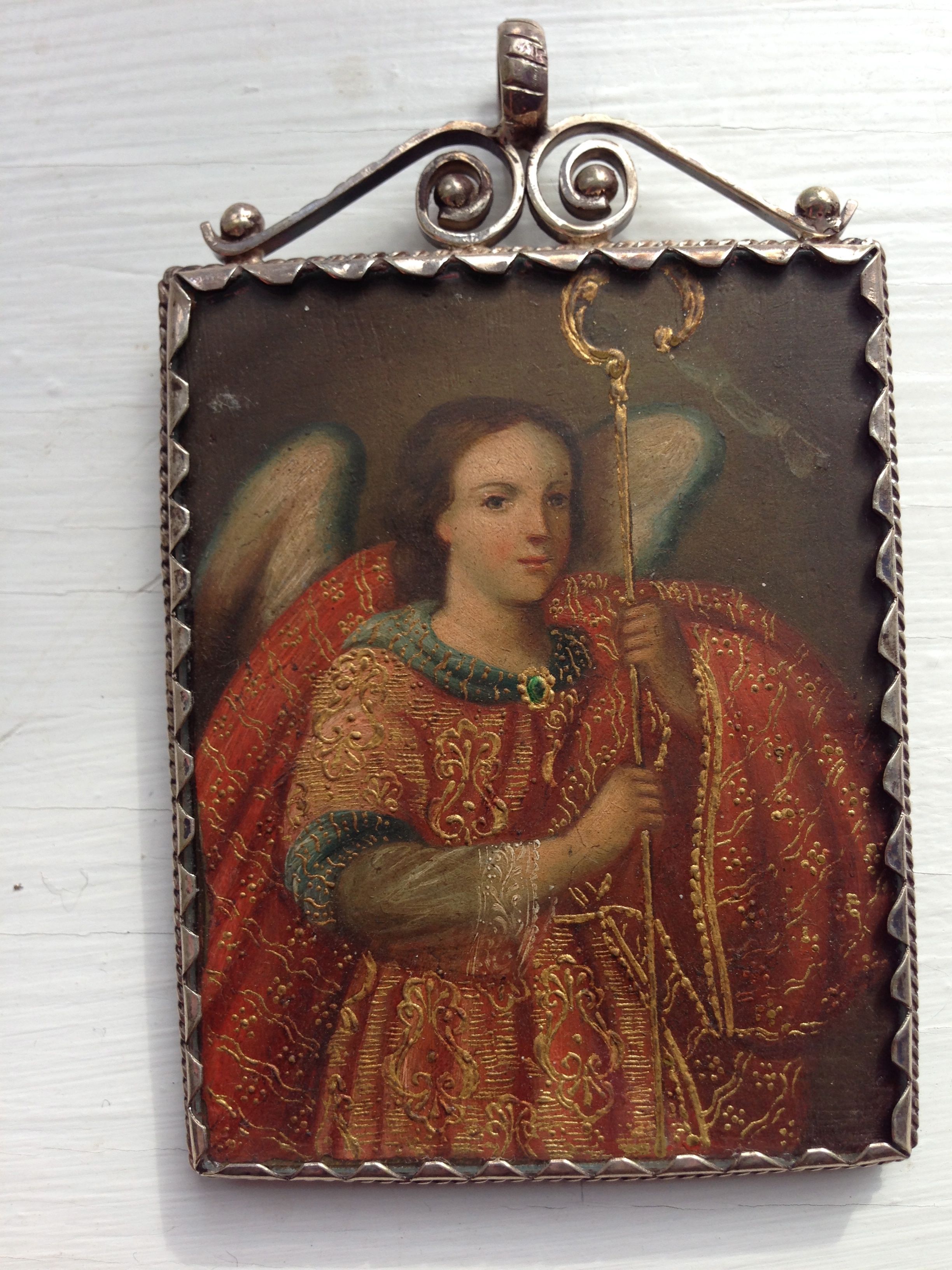 Relicario from Peru in a silver frame, early to mid 20th century. It depicts one of the archangels, perhaps San Rafael. Photo by Linnet, from my collection.