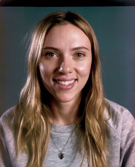 This may be my favorite of all the pictures, because I happen to be fond of Scarlett Johansson. The portrait could not be more different from the usual fare in her photo shoots. Typically she is styled and made up to the nines, and always has the same blank expression, with her lips slightly parted to look “sexy.” Here she gives what feels like a genuine smile. Look at the ordinary, thinnish hair, and the lovely skin. The sweatshirt made me laugh.