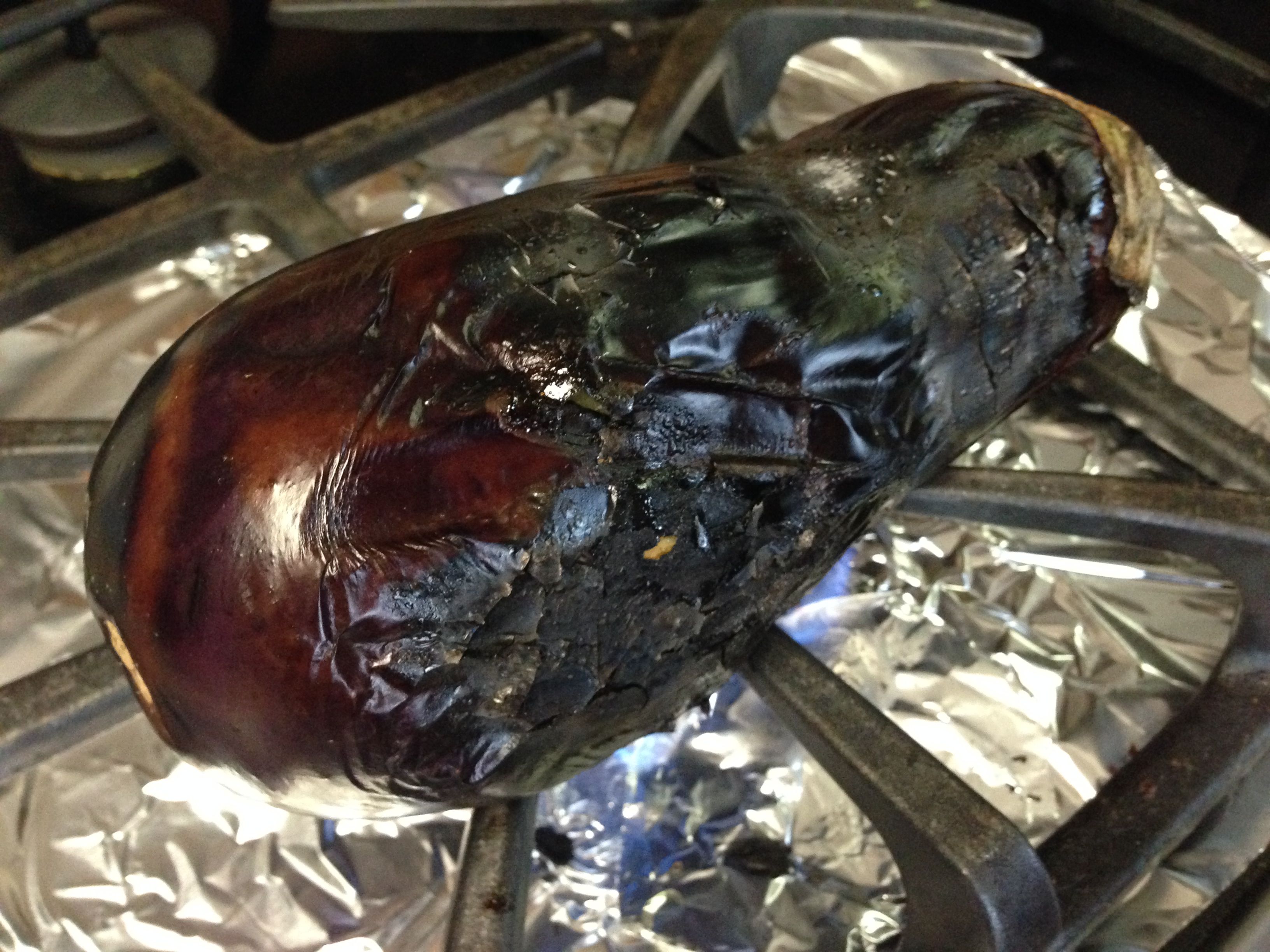 Finally, I tried charring a small eggplant (or aubergine, a term I much prefer) directly on the gas burner, using tongs to rotate it every so often. This is exciting, risky and messy. The vegetable becomes soggy and floppy, collapsing in on itself. It develops fissures that leak and sputter and drip and sizzle. Bits begin to glow.