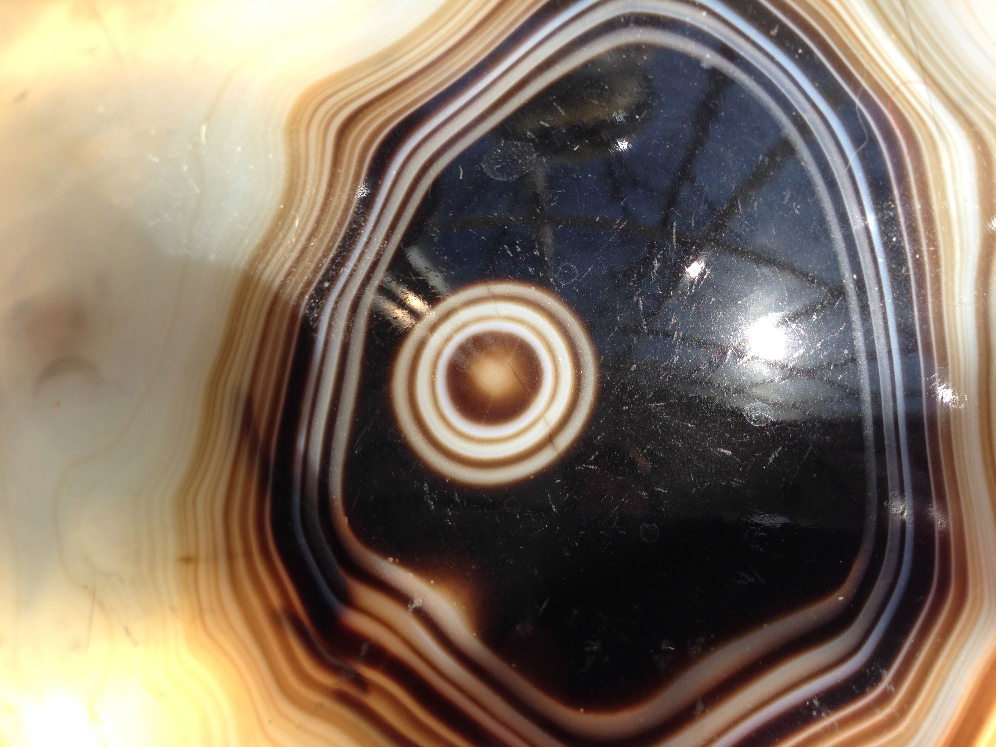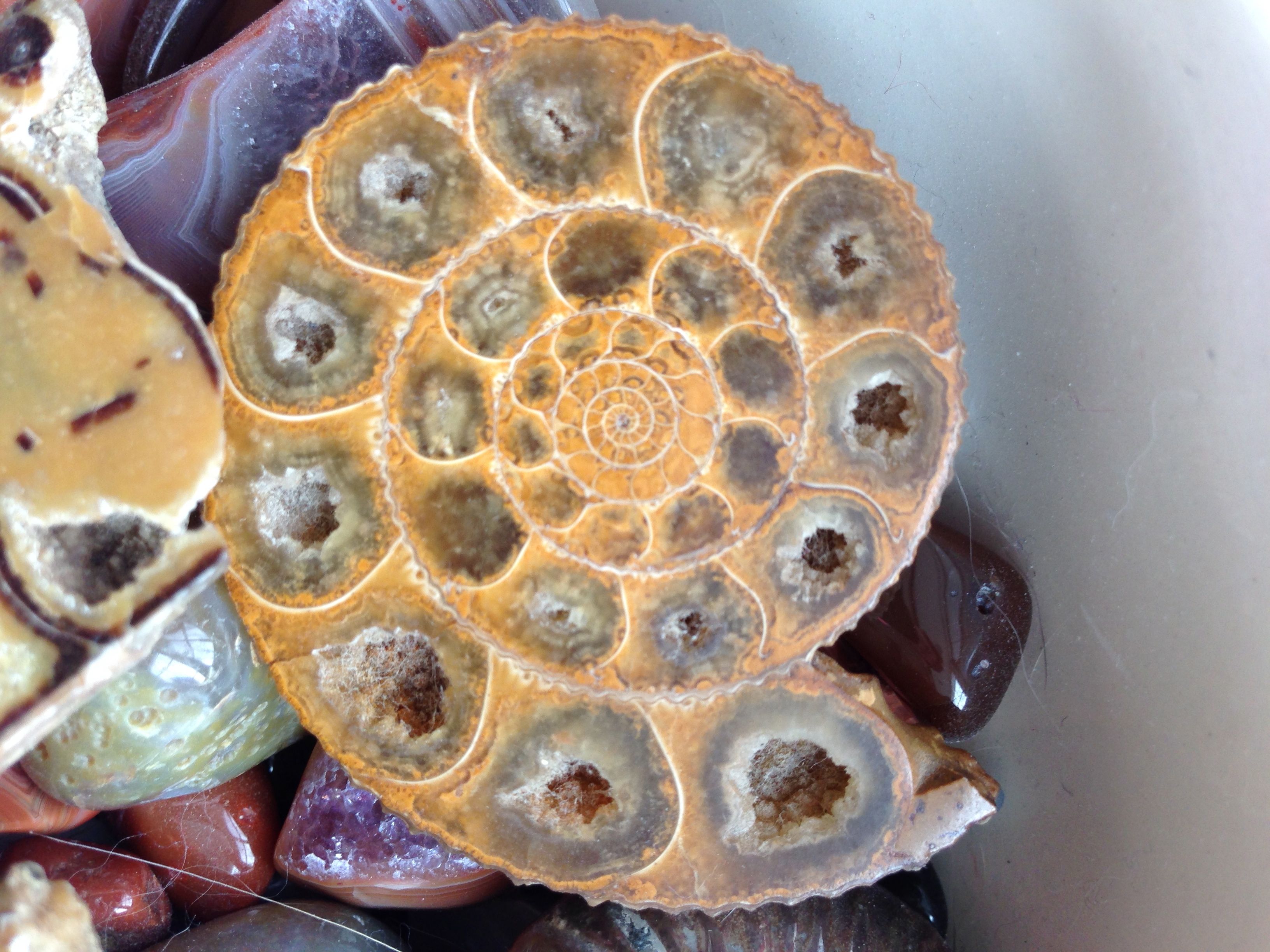 This is a bowl full of lovely things. There are several baculites, which are like ammonites except straight rather than round. Like ammonites, some have very beautiful sutures between each segment. The patterns are reminiscent of fractals or lace. Also there are a couple of whole ammonites, including one that still has a pearlescent shell, and a big red Lake Superior agate.