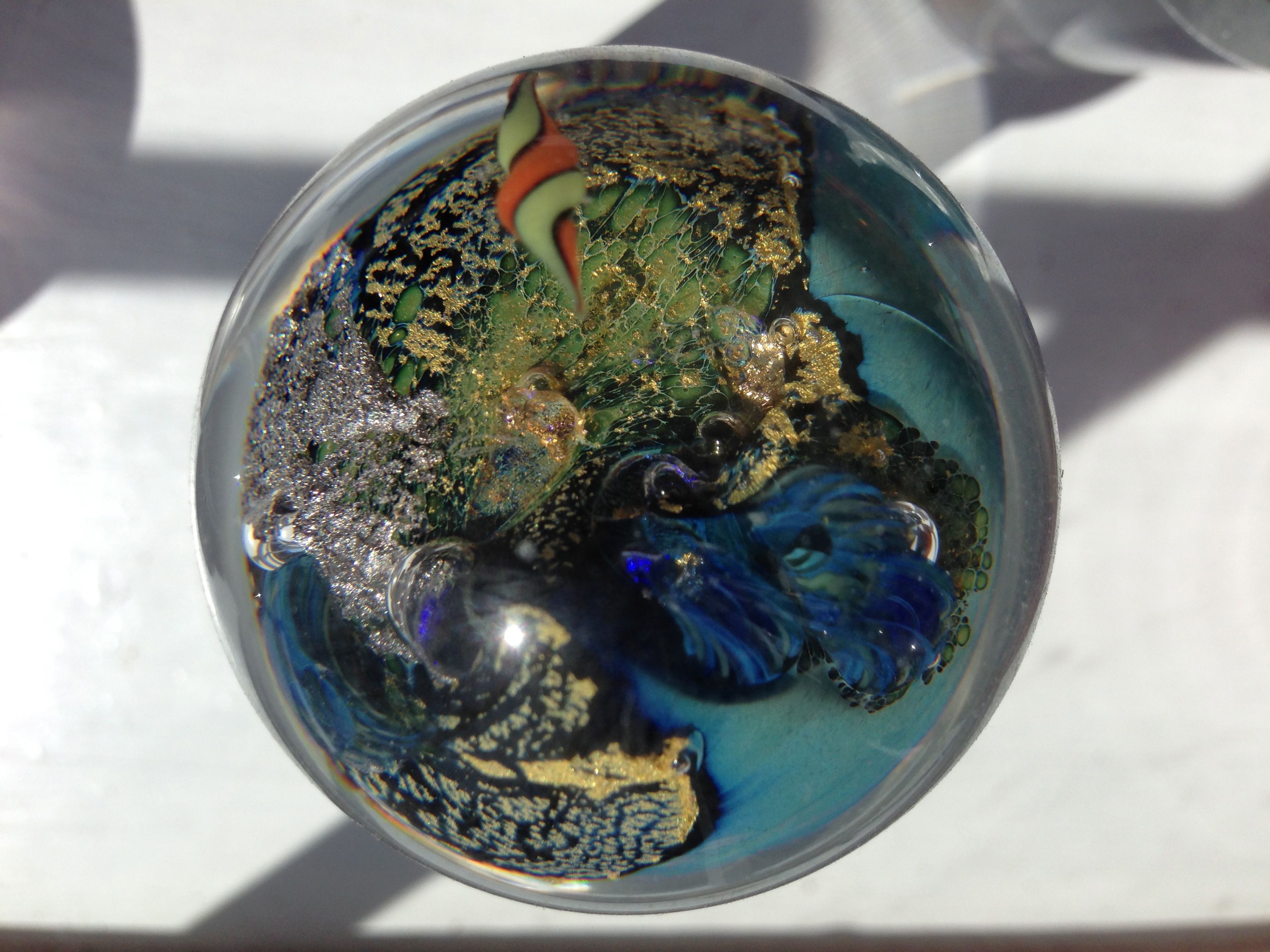 I am very fond of gem and mineral spheres as well as glass spheres. This one is by glass artist Josh Simpson. It is from his “planets” series.