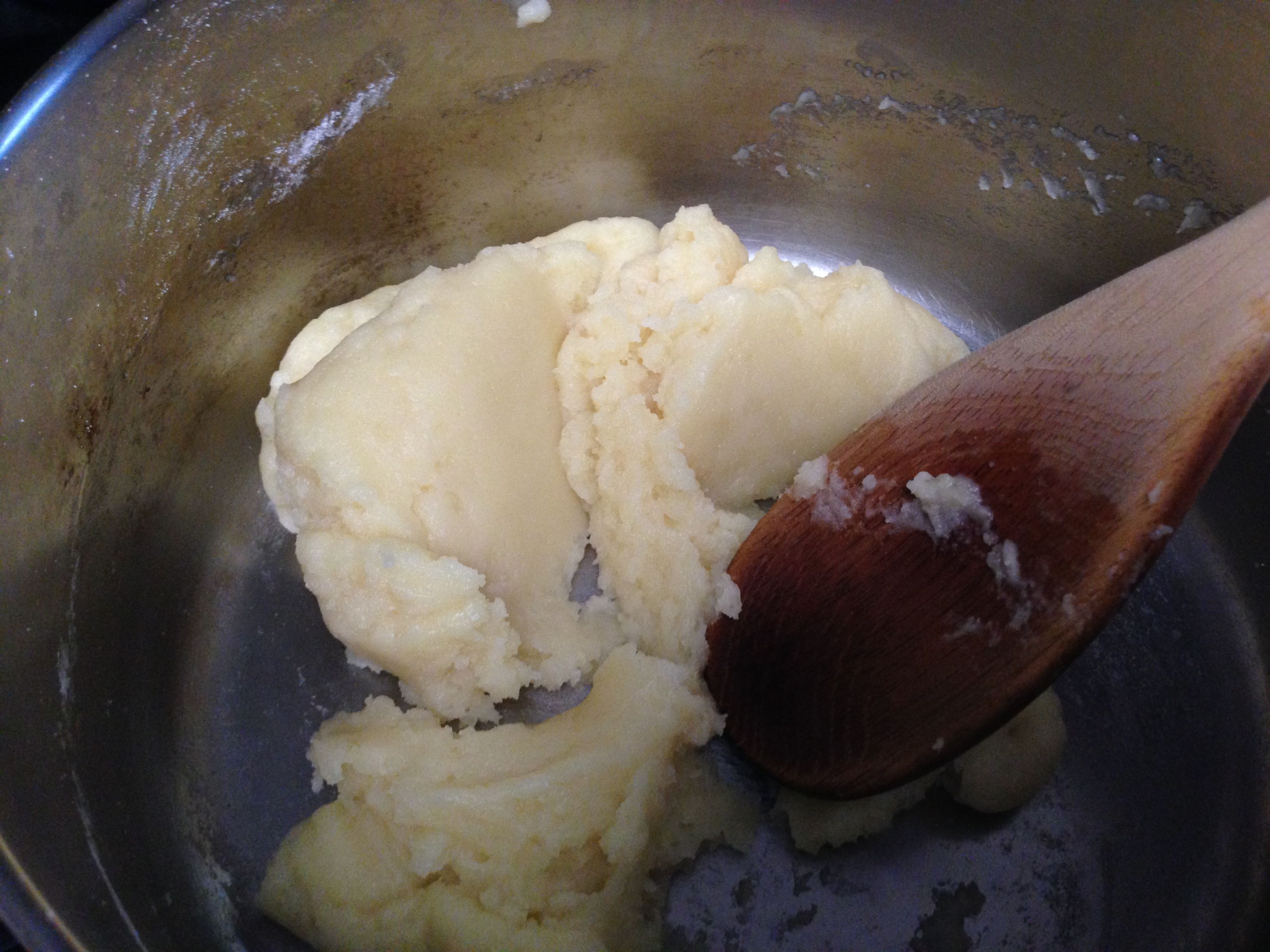 I measured the butter with extra care this time, using a measuring cup (I also vowed to get a kitchen scale and stop messing about with cups!) After adding the flour, I cooked it well over ten minutes to make sure that it was dry and that the flour was nice and toasty. Now for the real test: the eggs!