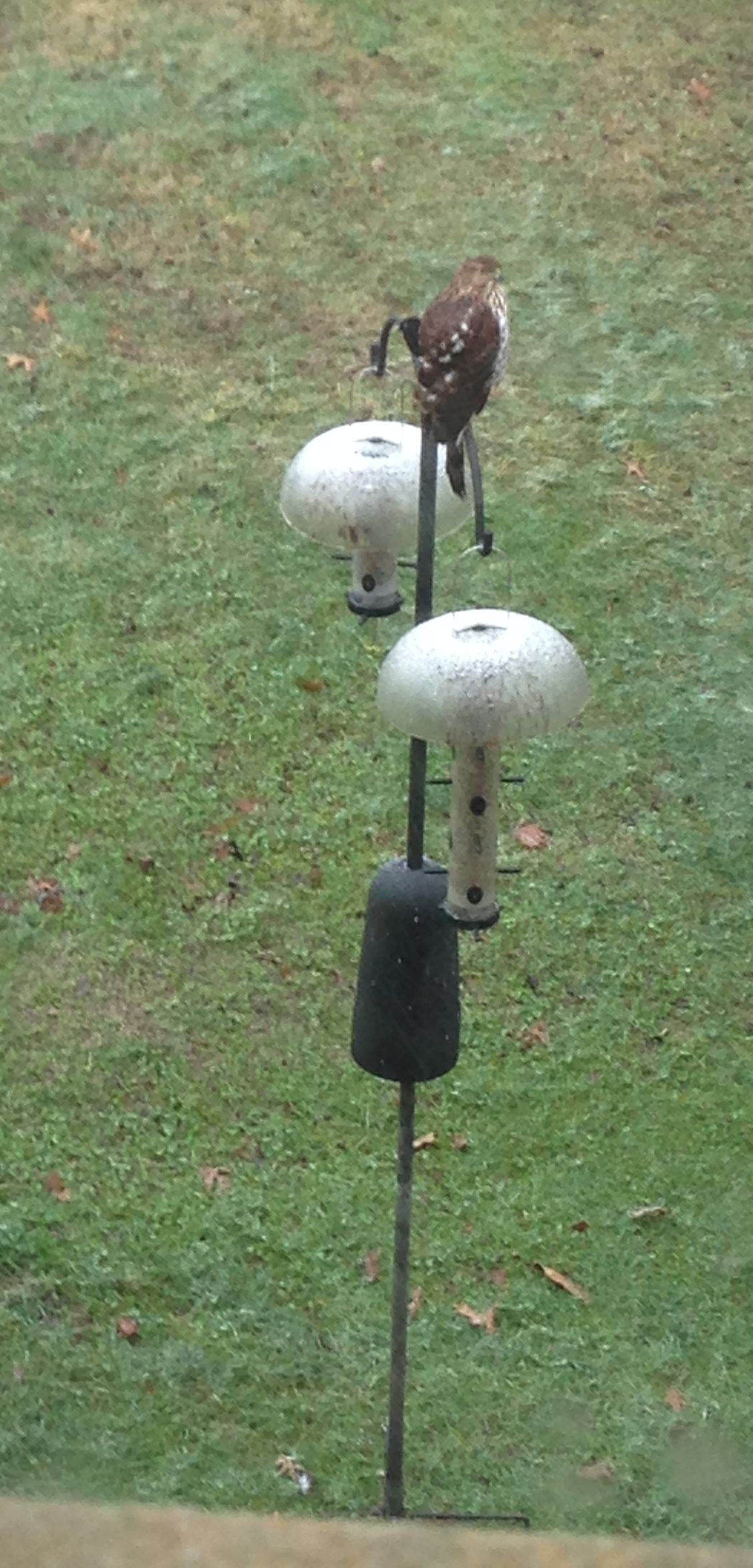 It is a juvenile sharp-shinned hawk, the smallest North American hawk. They like oak and conifer forests, so perhaps this one has been living in the park near our house. According to Wikipedia, these hawks favor small songbirds as prey and often target backyard bird feeders. A couple of months ago, one took a small bird from under my nose as I was standing at the kitchen window. It was over in an instant. A flash of wings, a loud thump against the window, a few feathers floating on the breeze.