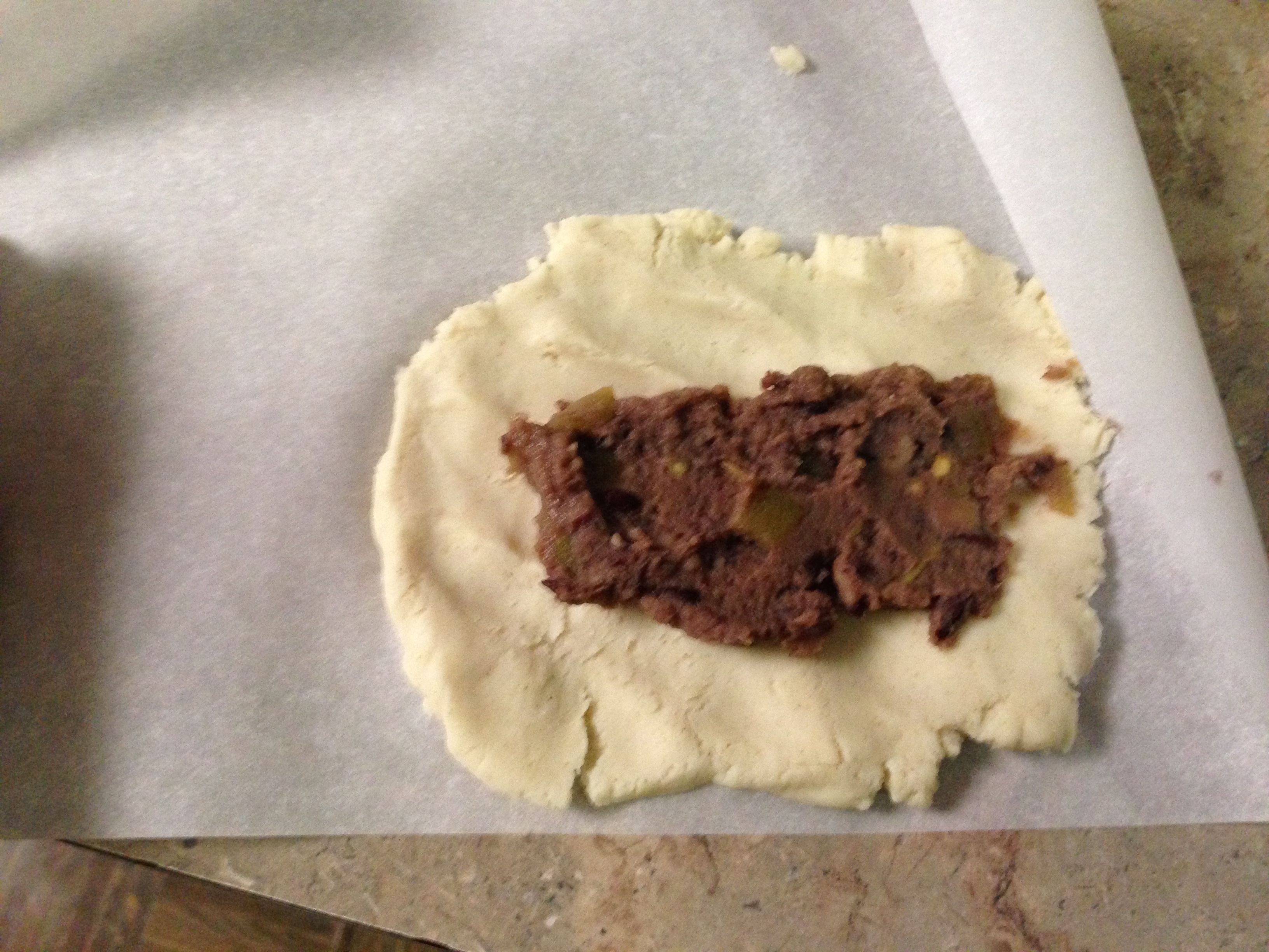 Spread the dough to about four by five inches. I use a third of a cup of dough for each tamale.