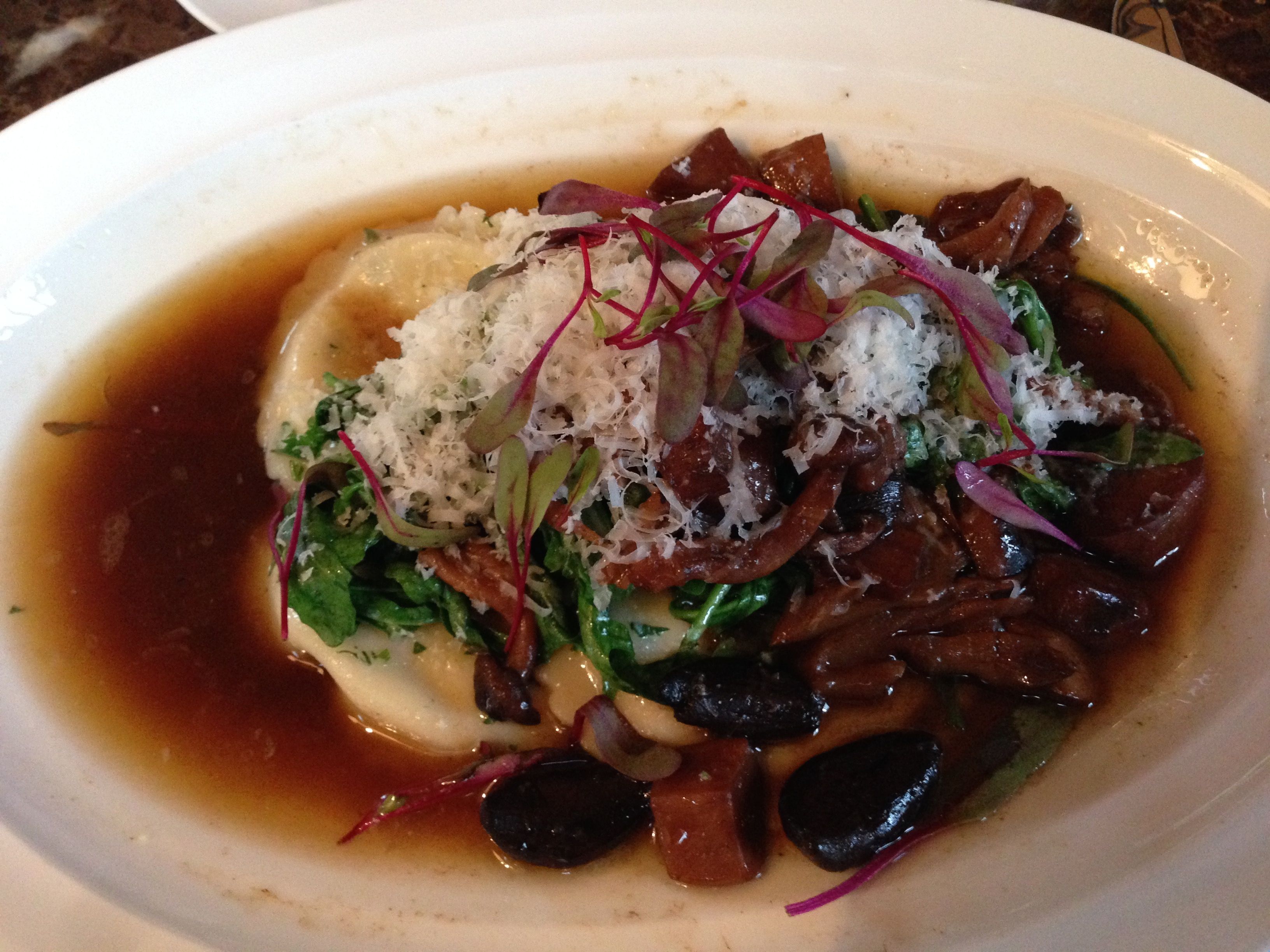 XIX is the kind of place that tolerates vegetarians rather than actively discouraging them. Many restaurants do this. They have a token meatless dish on the menu in case someone in the party is a vegetarian. If a pair of vegetarians arrive for dinner, they are forced to eat the same thing, which is no fun unless you are in the hands of a genius, working your way through an inspired tasting menu. The token offering at XIX was lemon ricotta ravioli with brown butter and wild mushrooms. I thought it sounded a bit odd. But I didn’t have much choice.