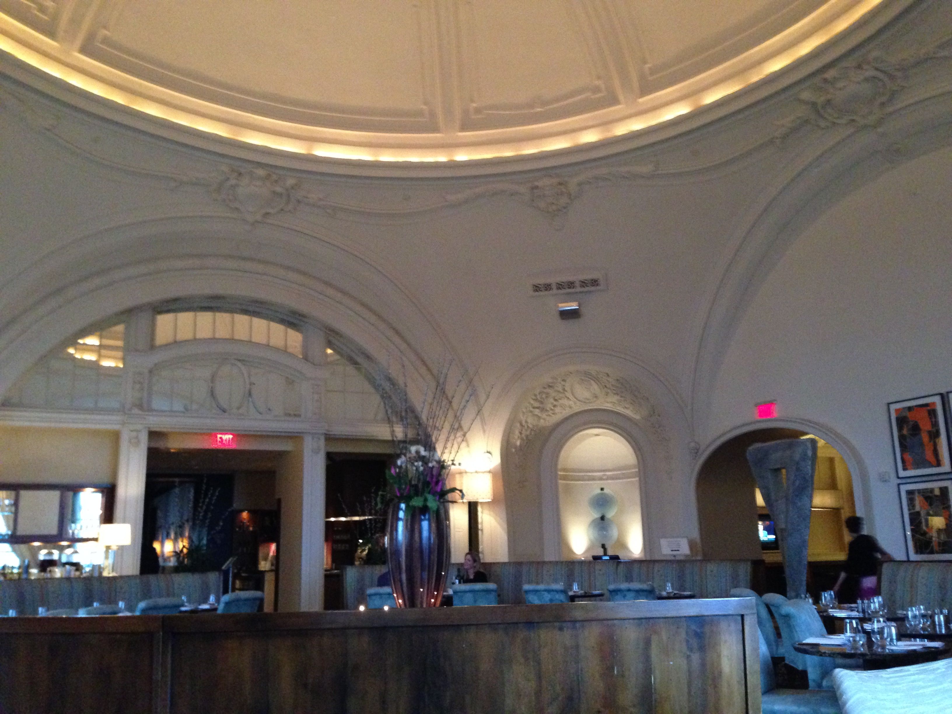 Remodeled in the 1990’s, XIX could use an update in my opinion. The rug is a dingy brown pattern which does nothing for the space, and the wood banquette is scratched and dull in places. It’s in need of some loving care. On the other hand, the alcoves have a beautiful lining of translucent, pearly mica, which hides the light sources behind. And the dome with its moldings and stained glass aperture feels like the roof of heaven. After dark, this must be a stunning place in which to find oneself, especially when accompanied by a Beautiful Man.