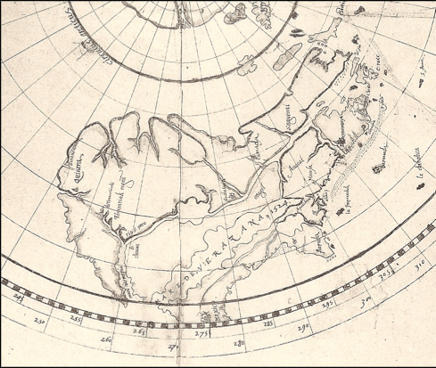 “Humfray Gylbert knight his charte. T.S. [i.e. John Dee] fecit.” Ca.1582-1583, This part of the map shows North America.