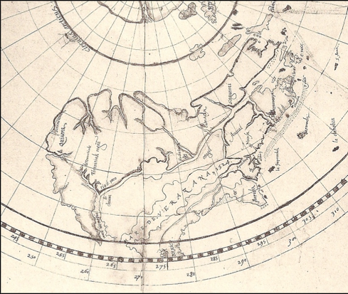 “Humfray Gylbert knight his charte. T.S. [i.e. John Dee] fecit.” Ca.1582-1583, This part of the map shows North America.