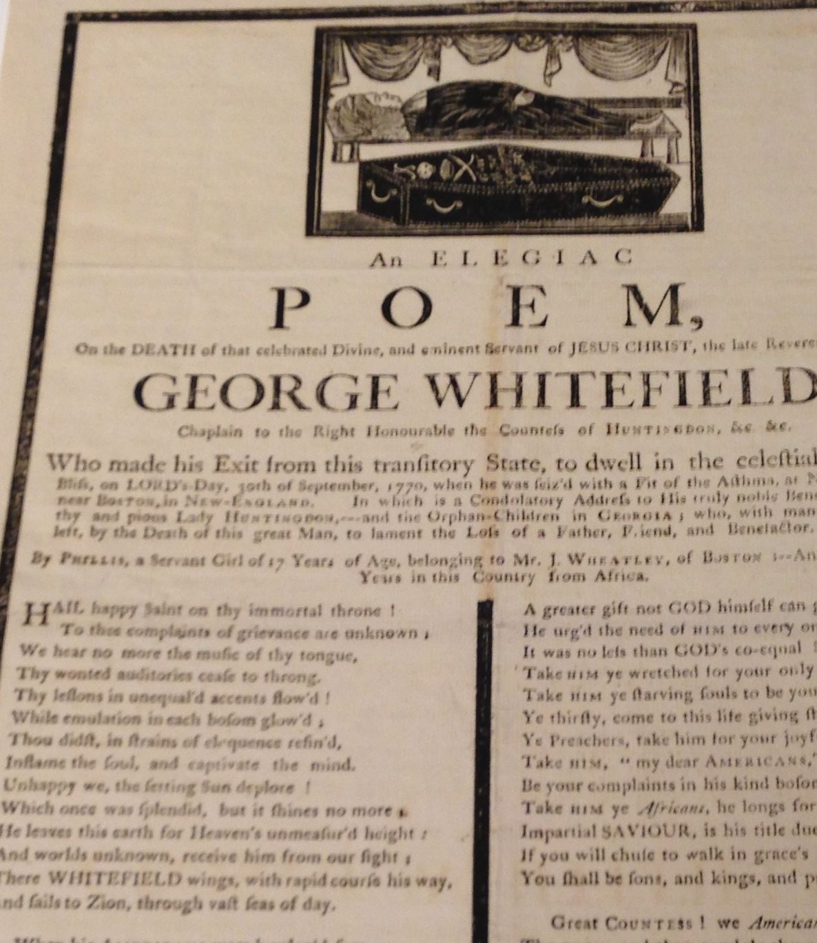 A poem by Phillis Wheatley, the first published African-American woman and the first published African-American poet. The introduction says “By Phillis, a servant girl of 17 years of age, belonging to Mr. J. Wheatley…”