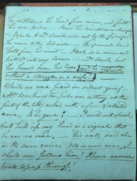 An eyewitness account of George Washington’s death by his secretary Tobias Lear: “and he expired without a struggle or a sigh!” No wonder, since 40% of his blood was drained by the physicians trying to cure him.