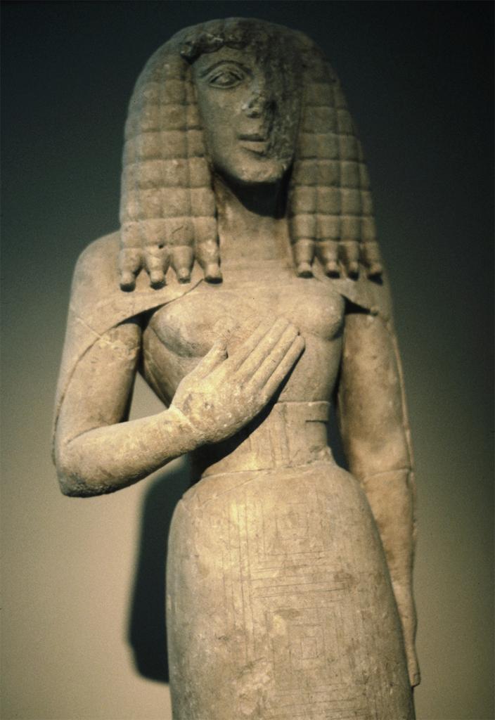 The small (75 cm) Auxerre Goddess is a rare example of a female figure in the Daedalic style. Originally from Crete, she was “rediscovered” in a storage room of a museum in Auxerre, France in 1907. She wears a Cretan belt and has wig-like hair very similar to those of my fictional Philadelphia Apollo. And she smiles the gentle Archaic smile.