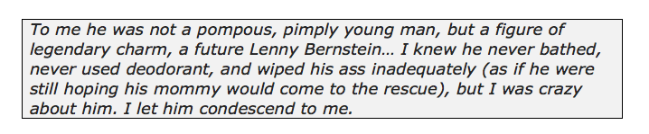 But to balance this picture, Jong adds a scene later in the book where Isadora is nearly raped by a porter on a train. The zipless fantasy doesn’t work –in fact it goes horribly wrong– unless it’s the right man. Compare Alexander Portnoy, who had a habit of accosting women in the streets of New York and asking if they’d like to go home with him. He really didn’t give a damn who they were, as long as they had a cunt.