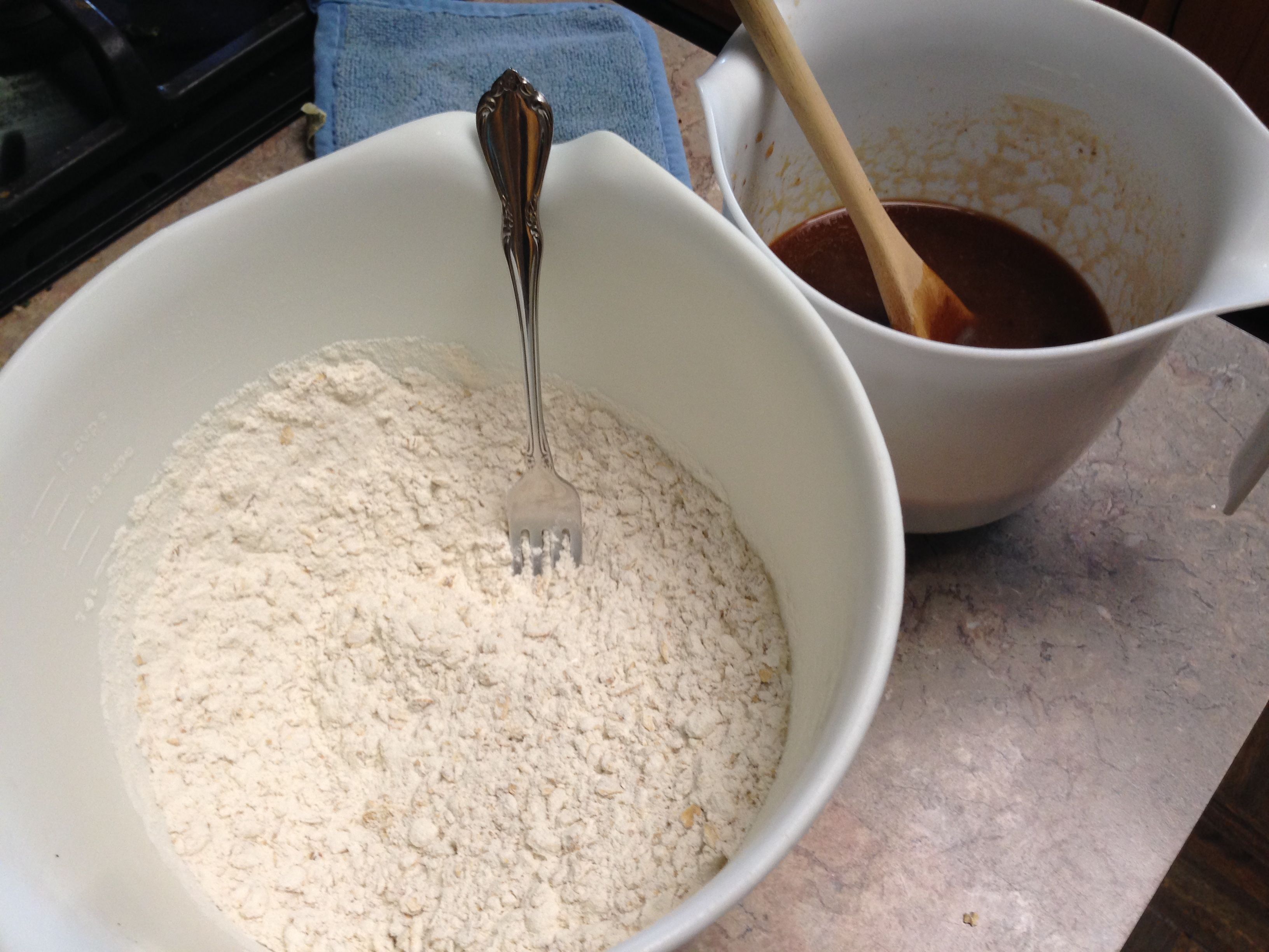Add the dry ingredients to the wet and mix well. Divide into two equal amounts. Fold the Cowboy additions into one and the Cowgirl bits into the other.