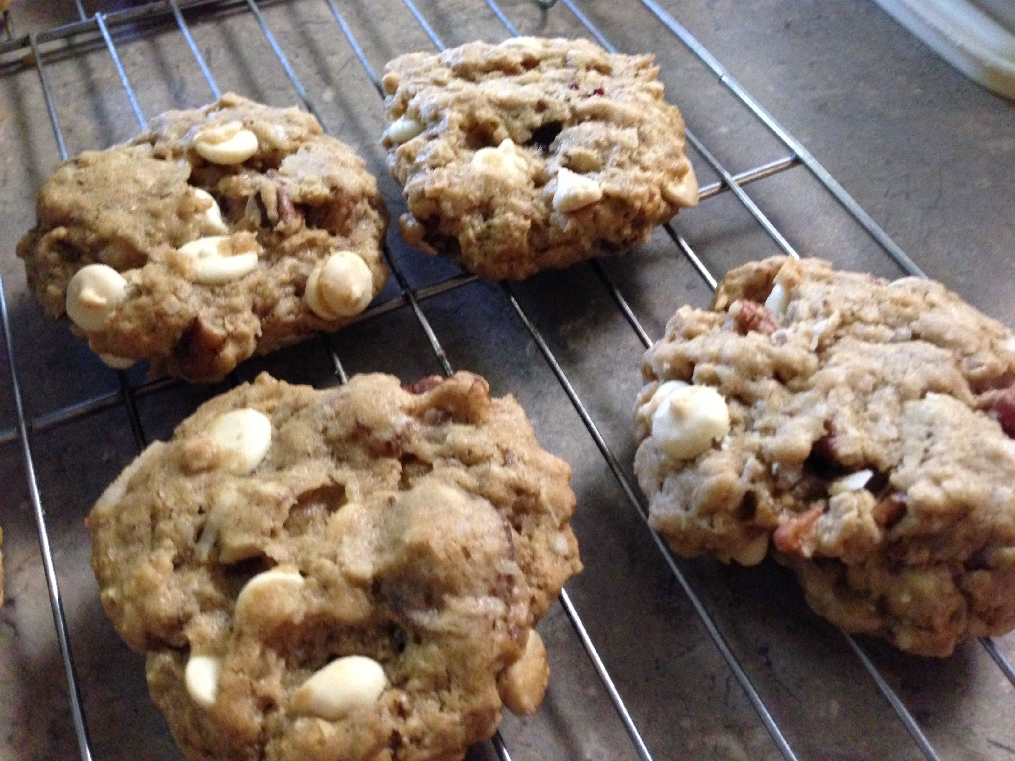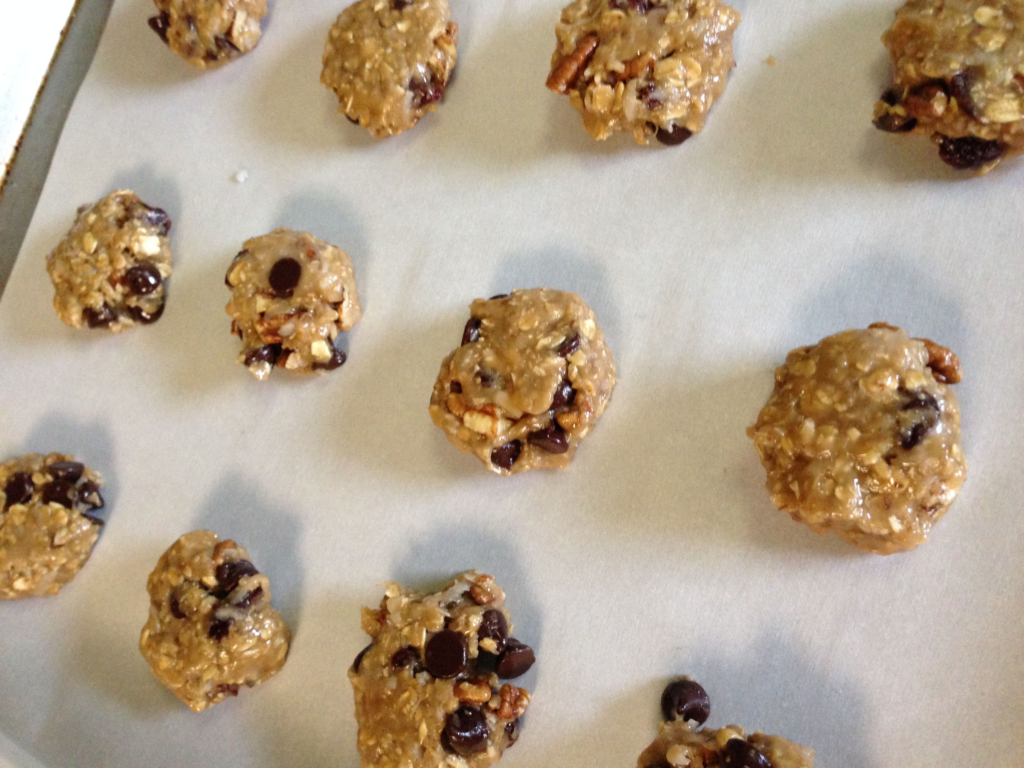 Use a spoon and your hands to form balls the size of large walnuts and place on the baking sheets. Flatten slightly with the bottom of a measuring cup or glass. Wetting your hands with water will prevent sticking. If the white chocolate chips fall out of the Cowgirls, squish them back in on top of the flattened cookies.