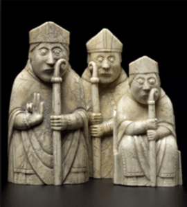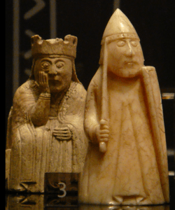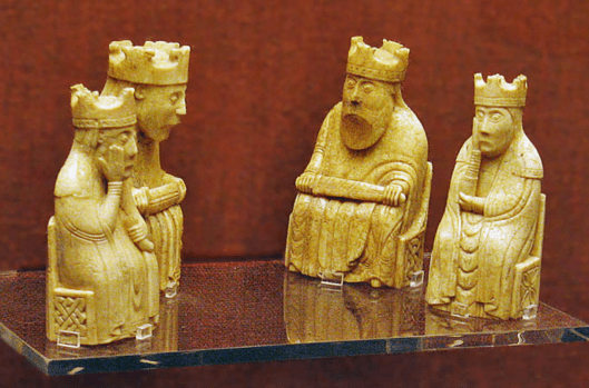 Among the most beloved treasures in the British Museum are the Lewis Chessmen, carved from walrus ivory and whale teeth in the late twelfth century, probably at Trondheim in Norway. Someone, perhaps a merchant, buried a hoard of these and other game pieces (and one belt buckle) on Lewis in the Outer Hebrides of what is now Scotland (then, part of Viking Norway). He was probably on his way to Dublin to sell them, but fate intervened.