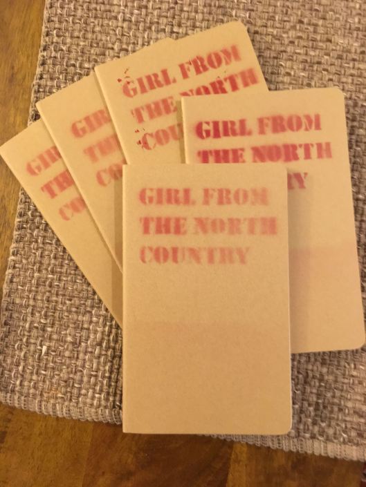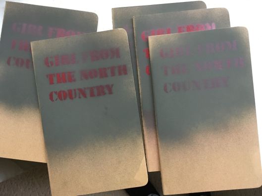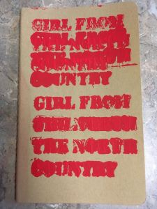 This time around, Himself is in a Conor McPherson play based on the songbook of Bob Dylan. I tossed around lots of ideas (a keychain? a bracelet?), but the one I kept coming back to was something different. When I travel, I always record my thoughts about the trip in a journal, and for some reason, I conceived a powerful desire for a journal with “Girl From the North Country” on it.