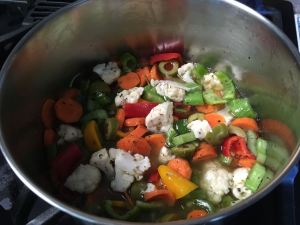 Chop 2 lbs worth of sweet and hot peppers, carrots, celery and cauliflower into bite size bits. (I go easy on the hot peppers and use mostly Anaheim and mini sweet peppers, but the hotties are characteristic of this pickle.) Place in a gallon ziplock bag with a big handful of kosher salt and 8 cups water. Store 24 hours in the refrigerator in a pan to catch any leaks.
