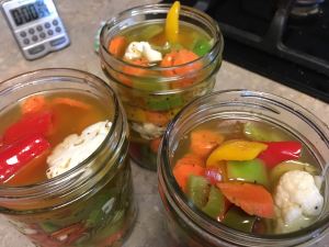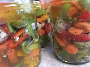 Heat 2 cups neutral oil (canola) and 2 cups white vinegar, plus your seasonings (a generous amount of sliced garlic, chili flakes, celery seed, dried oregano, thyme, marjoram, black peppercorns). Add the veggies and simmer a few minutes.