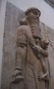 An Assyrian statue in the Louvre, of a hero overcoming a lion, is thought to represent either Gilgamesh or Enkidu. Gilgamesh, by the way, is believed to have been a historical king of Sumer.