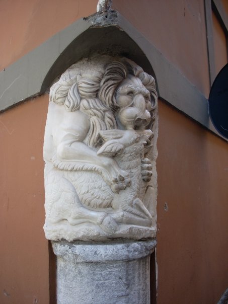 Column capital of a lion attacking a sheep, in a street near the Palazzo Altemps in Rome. Late antique or medieval (?). Photo by the author.