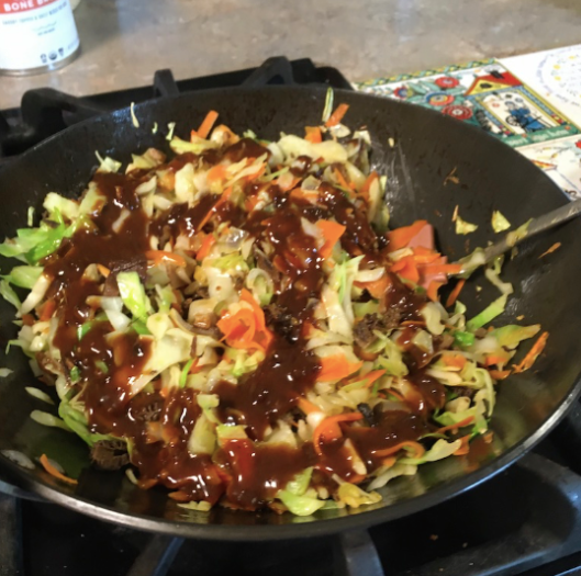 Step 2: Sauté the cabbage and carrots that were ageing in the fridge. Add home-made hoisin sauce concocted from prunes, garlic, honey, vinegar and ssamjang paste.
