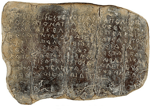 A lead curse tablet written in Greek, from Sicily (5th century BCE). Lead was often used as a writing material because it was soft enough to be easily marked with a stylus.