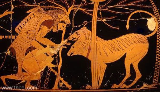 An Athenian vase in the Louvre shows Heracles petting Cerberus, the hound of Hades (note the chain in his other hand). Photo: Theoi.com; click for link.